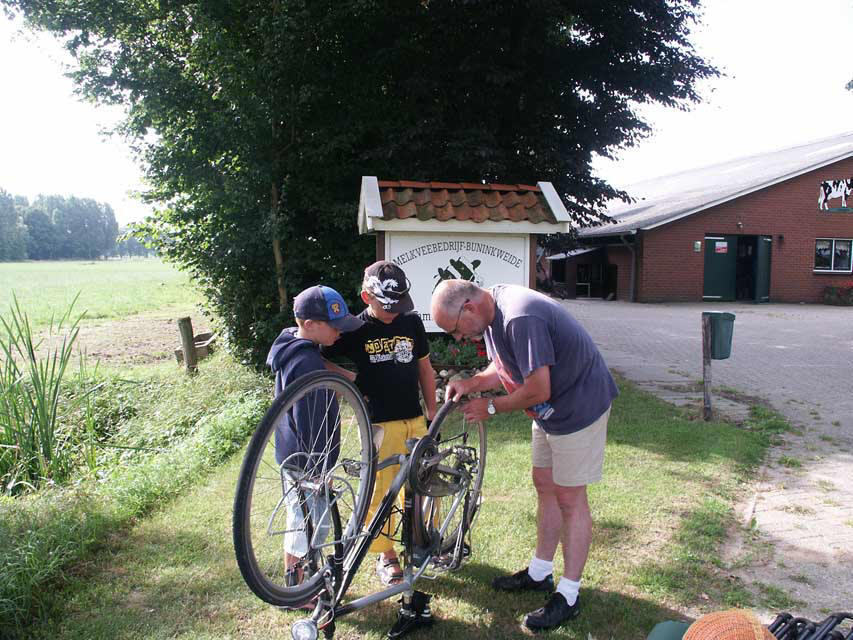 Via Bredevoort - Bekendelle aangereden en net buiten het dorp de eerste lekke band van de vakantie. Dus : tout la famille in de berm en papa plakken...Gelukkig konden we al gauw weer verder en met wat wind en een zonnetje trapten we al gauw heerlijk rustig door het Woold. Bij een boerderij stond een tuintafel,met wat gezellige tuinstoelen,thermoskannen met koffie en thee en een heerlijk ouderwetse koektrommel.Of we zelf wat geld in een blikken busje wilden doen - en zo zaten we dus onverwachts midden in het Woold aan de lekkerste bak koffie en op het leukste "terrasje" tot nu toe....